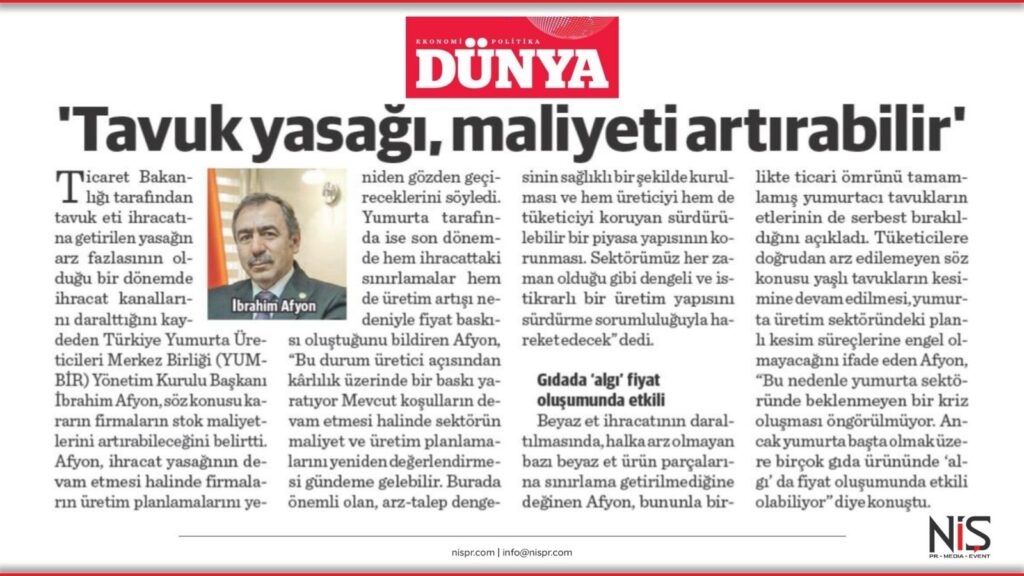 Afyon, ihracat yasağının devam etmesi halinde firmaların üretim planlamalarını yeniden gözden geçireceklerini söyledi. Yumurta tarafında ise son dönemde hem ihracattaki sınırlamalar hem de üretim artışı nedeniyle fiyat baskısı oluştuğunu bildiren Afyon, “Bu durum üretici açısından kârlılık üzerinde bir baskı yaratıyor. Mevcut koşulların devam etmesi halinde sektörün maliyet ve üretim planlamalarını yeniden değerlendirmesi gündeme gelebilir. Burada önemli olan, arz-talep dengesinin sağlıklı bir şekilde kurulması ve hem üreticiyi hem de tüketiciyi koruyan sürdürülebilir bir piyasa yapısının korunması. Sektörümüz her zaman olduğu gibi dengeli ve istikrarlı bir üretim yapısını sürdürme sorumluluğuyla hareket edecek” dedi.